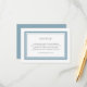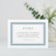 Cette carte de détails mariage classique moderne comporte une couleur modifiable ; pour changer la couleur de la bordure et de l'arrière - plan arrière de bleu poussiéreux à la couleur de votre choix, cliquez sur le bouton personnaliser et modifiez simplement la couleur de l'arrière - plan avant et arrière. Personnalisez-le en remplaçant le texte de l'espace réservé. Pour plus d'options comme changer la police, sa taille et l'espacement entre les lettres cliquez sur le bouton "Personnaliser". *Veuillez noter que le filigrane Zazzle qui apparaît dans l'aperçu du zoom n'apparaîtra PAS sur le produit imprimé final. © Bois de rose et agrumes
