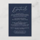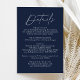 Carte de détails de mariage simple et élégante avec un script blanc manuscrit mélangé avec du lettrage moderne contre un arrière - plan de la marine. Personnalisez la carte de détails minimalistes pour les mariages avec vos coordonnées mariage telles que les informations de réception, les chambres d'hôtel, le site Internet des mariages, etc. La carte de détails du mariage de marine est parfaite pour les mariages modernes.