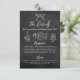 Carte De Boîtier De Style Chalkboard Dessinée À La Main Quirky Whimsical Mariage Détails. Cette carte amusante et ludique présente un arrière - plan en damier noir avec des illustrations blanches dessinées à la main qui ressemblent à de vrais croquis à la craie. Un arc de cercle se dresse au sommet, entouré d'éléments mignons comme une vitre à champagne, des anneaux mariages, des ustensiles de cuisine, un gâteau à plusieurs niveaux, une boule de disco et une voiture "Just Married", ajoutant une touche joyeuse et légère. La disposition avant utilise un mélange de script manuscrit et de lettrage à la craie simple, ce qui lui donne un aspect décontracté mais élégant. Il y a beaucoup d’espace pour inclure vos détails de réception, votre code vestimentaire, l’hébergement, les informations sur le transport et même votre site Web mariage. La mise en page entièrement personnalisable vous permet d'ajuster le texte en fonction de vos besoins et de votre style d'événement. Parfait pour les couples qui veulent une façon unique et créative de partager leurs informations de mariage, cette carte imprimée ajoute charme et personnalité à votre suite tout en gardant les choses claires et faciles pour vos invités.