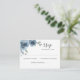 Carte RSVP de mariage moderne et élégant bleu poussiéreux. Carte RSVP florale avec fleurs d'aquarelle peintes à la main en bleu ardoise avec verdure et script de calligraphie moderne. Vous pouvez personnaliser le libellé, le style de police, la couleur et la taille devant et derrière cette carte RSVP botanique. Éléments correspondants disponibles.