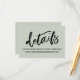 Gardez vos invités de mariage dans la boucle avec tous vos détails en utilisant ces jolies cartes d'insertion de mariage modernes. Un texte en surimpression décontracté a été conçu en utilisant une police manuscrite décontractée en noir, indiquant simplement "détails". Utilisez les champs du modèle pour personnaliser ces cartes avec vos informations personnelles. La couleur de fond peut être changée en n'importe quelle couleur de votre palette de mariage que vous choisissez; tout le texte modifiable apparaît en noir. // 100 //