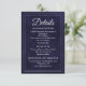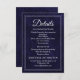 This elegant wedding details card features a rich navy blue textured background paired with refined white typography for a timeless, formal presentation. Designed to complement classic and black-tie wedding stationery suites, the layout clearly organizes accommodations, reception information, and additional details in a clean, easy-to-read format. A graceful script headline combined with traditional serif text creates a sophisticated balance, while the double-line border adds a polished finishing touch. Perfect for couples hosting formal, evening, or traditional weddings who want to share essential guest information in a coordinated and upscale style.