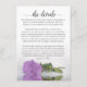 Cette belle carte de boîtier mariage est conçue pour vous donner plus d'espace pour toutes les informations dont vos invités peuvent avoir besoin, y compris le site Web, le registre, la réception, les voyages, l'hébergement, ou tout autre détail. La carte présente un design magnifique avec un rose couleur violet lilas réfléchissant et un titre de calligraphie en dentelle avec "les détails". Le dos est marbré clair violet ou violet.