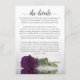 Cette belle carte de boîtier mariage est conçue pour vous donner plus d'espace pour toutes les informations dont vos invités peuvent avoir besoin, y compris le site Web, le registre, la réception, les voyages, l'hébergement, ou tout autre détail. La carte présente un design magnifique avec un rose unique reflétant la couleur prune violette et un titre de calligraphie en dentelle avec "les détails". Le dos est marbré violet ou violet foncé.