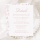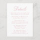 Complétez votre suite mariage avec notre Elégante Dusty Rose Pink Chinoiserie Victorian Floral mariage fiche détaillée. Ce design présente des "Détails" affichés dans un script de calligraphie rose rose poussiéreux, en contraste avec un arrière - plan blanc. Personnalisez la carte de détails mariages avec des détails mariages importants tels que votre lieu de mariage, les chambres d'hôtel, les itinéraires et le site Web mariage. Le dos de la carte présente un motif floral d'inspiration chinoise rose rose.