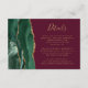 Le bord gauche de cette élégante carte de boîtier de détails mariages moderne comporte une bordure d'aquarelle vert émeraude bordée d'une parties scintillant en faux or. Le texte est en écriture manuscrite de couleur or et en police de caractères cuivre sur un arrière - plan bordeaux. L'envers est assorti d'un design d'agate vert et or.