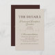 Partagez des informations importantes avec style en utilisant cette carte d'encart de détails de mariage marron Mousse Moderne, conçue avec une typographie claire et un ton neutre chaud. Le dos comporte un code QR pratique reliant les invités à votre bloc d'hôtel réservé ou à votre page d'hébergement. Élégante, simple et fonctionnelle, cette carte est parfaite pour les couples qui souhaitent tenir les invités informés tout en maintenant une esthétique minimaliste cohérente.