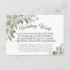 Cette belle carte mariage est une façon de demander à vos invités de l'argent ou de l'argent en guise de cadeaux. L'élégant design présente un magnifique design boho chic rustique avec des lettrages élégants et des ressorts aquarelles peints à la main de feuilles d'eucalyptus et de verdure dans les tons menthe, mousse et vert sauge. Le titre se lit "Wishing Well" avec un poème mignon : "Tandis que nous commençons notre nouvelle vie en tant que Mr. & Mme Nous avons déjà une maison pleine de plats Mais si vous voulez nous donner un cadeau Un cadeau de quelques espèces serait si agréable! Il y a de l'espace en bas pour une petite note.