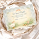 Un design de baby shower charmant de style livre d'histoires mettant en vedette une douce oie à l'aquarelle debout à côté d'un nid rempli d'œufs pastel. Des fleurs délicates de printemps et une verdure douce créent une scène de campagne douce, tandis qu'un nœud papillon rose pâle et un fond à carreaux gris-vert ajoutent une touche de cottagecore cosy. Le style d'illustration vintage et la palette de pastels doux donnent à ce design une atmosphère de nurserie fantaisiste, parfaite pour une célébration de bébé ludique et chaleureuse.