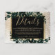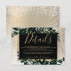 Un mariage moderne, chic et élégant avec une typographie dorée jaune et des détails floraux verts de Noël en hiver, avec un feuillage de feuille aquarelle verte peinte à la main sur un fond doré élégant avec de la neige et des flocons de neige blancs.