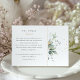 Offrez à vos invités tous les détails essentiels de votre journée spéciale avec cette carte d'information mariage élégamment conçue. La carte présente une étonnante aquarelle illustrant la verdure avec une touche bohème, accentuée de specks dorés pour une touche de luxe. Les teintes de sauge, d’olive et d’eucalyptus sont complétées par ces reflets chatoyants, créant une pièce à la fois instructive et esthétique. La carte est conçue pour transmettre d'autres détails mariages tels que les directions, les détails de la cérémonie et les préférences de cadeau d'une manière aussi agréable que l'événement lui-même.