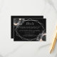 Cette élégante carte de détails mariage moderne dispose d'un cadre géométrique argenté décoré de pêche, de fleurs noires et argentées et de parties scintillant en faux argent sur un arrière - plan noir. Le texte personnalisable combine écriture fantaisie gris argenté et fontes cuivre. L'envers est noir solide.
