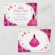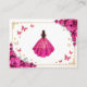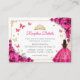 Fuchsia pink, gold and white Quinceanera reception details enclosure cards. Features brunette girl in ball gown dress, script font, gold butterflies, hot pink roses and tiara. Perfect for an elegant princess style glam celebration. Personalize with your own details.