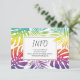 Carte de boîtier mariage gai et lesbienne arc-en-ciel tropical feuilles et confetti INFO. Il dispose d'un motif de monstère et de feuilles de palmiers dans les couleurs arc-en-ciel et votre texte dans un cadre. Le dos recouvre un motif en confettis colorés et un code QR pour plus de détails mariages.