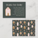 Whimsical Christmas theme baby shower book request card featuring illustration of a gingerbread house with pink accent. The card asks guests to bring in a new or used children's book instead of a card.