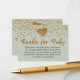 Voici un point de vue festif sur la tendance populaire des demandes de livre de baby showers. Ce design a été embelli de faux confettis d'or, et faux texte d'en-tête métallique d'or et les coeurs. Au-dessus de l'arrière - plan vert sauge modifiable, qui peut être changé à n'importe quelle couleur ou teinte que vous pouvez souhaiter, j'ai ajouté des graphiques qui simule des confettis de parties scintillant or et un coeur de parties scintillant or. // Sur le devant, un en-tête gras dit "Livres pour bébé" dans une police de caractères gras et élégante, que j'ai ajouté comme une superposition graphique. Un autre graphique, placé sur le dos, dit "Merci pour aider à construire la bibliothèque de notre bébé". Le texte a également été embelli dans le traitement graphique de la parties scintillant d'or. Sous cela, j'ai ajouté des zones de texte pour le message modifiable de chaque côté. Ils ont été remplis avec le type de porte-place que vous pouvez conserver ou modifier à votre propre libellé, police et couleur préférés. L'Internet est riche en termes possibles et il y a beaucoup de poèmes populaires qui décrivent l'objectif de la demande de livre qui remplace les cartes coûteuses tout en aidant le nouveau bébé à une appréciation de la lecture. J'ai décidé d'écrire un verset décalé pour le front et un message amical et explicatif pour le dos. Utilisez mon original, ou remplacez-les par l'une des nombreuses autres options que vous jugez appropriées. // 88 // Conçu par Melody Watson pour Paper Muserie.
