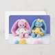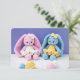 Enclosure card featuring original photography of handmade crochet bunny toys, created and photographed by the artist.