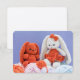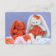 A small enclosure card featuring original photography of handmade crochet bunny toys.