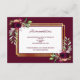 Une élégante carte d'hébergement mariage de style bohème. Un faux cadre doré et blanc. Roses et plumes d'eau, fleurs en bordeaux. Modèles pour les détails de votre hébergement mariage. Arrière - plan bourguignon et texte. Retour : arrière - plan de couleur bordeaux.