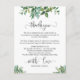 La feuillure aquarelle verte orne cette carte pour accueillir vos invités de mariage et les informer de vos événements prévus. Une carte compacte qui peut être ajoutée à un sac de faveur avec une police moderne (Les mots de script ne sont pas modifiables). Notre illustration unique.