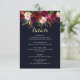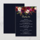 COULEUR DE FOND CHANGEABLE. Carte d'information sur les détails du mariage de style bohème avec illustration aquarelle de pivoines et de roses bordeaux, marsala, rouges et roses avec accent de plumes sur fond bleu marine. Ceci est parfait pour les événements d'automne/hiver, floraux et de style bohème. Les articles assortis sont également disponibles.