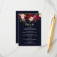 COULEUR DE FOND CHANGEABLE. Carte d'information sur les détails du mariage de style bohème avec illustration aquarelle de pivoines et de roses burgundy, marsala, rouges et roses avec accent de plumes sur fond bleu marine. Ceci est parfait pour les événements d'automne/hiver, floraux et de style bohème. Les articles assortis sont également disponibles.
