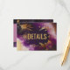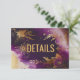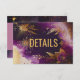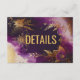 Cette carte luxueuse est ornée d'un riche arrière - plan violet, agrémenté d'étonnants motifs dorés et de délicats motifs floraux, parfait pour ajouter une touche de sophistication aux mariages, galas ou tout événement formel. L'inscription "DETAILS" en gras au centre est encadrée par un éventail de fleurs dorées et de feuilles, faisant de cette carte un choix exquis pour ceux qui apprécient les détails fins et une palette de couleurs régale. Idéale pour les informations sur les événements ou les messages spéciaux, cette carte est conçue pour impressionner.