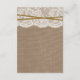 La collection rustique de mariage de plage dollar de sable est un design étonnant avec un bel arrière - plan rustique effet burlap avec une coupe romantique vintage effet dentelle blanche finie avec un étonnant dollar de sable et de ficelle. Ces Cartes Détail peuvent être personnalisées pour votre occasion spéciale et rendraient l'insert parfait assorti pour une suite mariage, douche nuptiale, fête de fiançailles, fête d'anniversaire et bien plus encore. Ces cartes peuvent être utilisées pour créer des cartes de détail, des cartes d'information pour les clients, des cartes d'hébergement, des cartes de direction, des cartes d'enregistrement des cadeaux ou des cartes de puits de souhaits, ainsi que des cartes de cérémonie et de réception. Les éléments mariages correspondants se trouvent dans la collection.