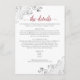 Cette belle carte d'enceinte est conçue pour fournir à vos invités des informations supplémentaires sur la réception, les hébergements, les arrangements de voyage, le registre, le site Web, les itinéraires, ou tout autre détail dont vos invités pourraient avoir besoin. Il présente un design simple mais élégant avec du texte rouge et gris sur un arrière - plan blanc, un titre de script en dentelle, et des boucles et tourbillons en faux feuille argent frileux dans les coins.