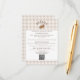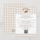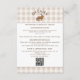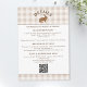 Carte d'accompagnement de mariage présentant le fond de carreaux beige de Destei avec un panneau blanc bordé de marron en haut et en bas pour le texte et le code QR. En haut, une illustration fantaisiste de lièvre à l'aquarelle est centrée avec un titre personnalisable incurvé au-dessus qui peut indiquer « Détails » ou tout autre titre personnalisé.