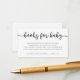 Une carte d'insertion de demande de livre pour le baby shower. Avec un script et un poème de calligraphie moderne : "UNE PETITE DEMANDE, NOUS ESPÉRONS NE PAS TROP DIFFICILE D'APPORTER UN LIVRE AU LIEU D'UNE CARTE ILS CHERCHERISERONT LE LIVRE, BIEN AIMÉ OU NEUF S'IL VOUS PLAÎT SIGNER L'INTÉRIEUR AVEC UN MESSAGE DE DE VOUS!"