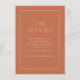 This elegant wedding enclosure card features a minimalist and sophisticated design with a warm terracotta background. The clean, modern typography adds an air of refinement, making it perfect for conveying essential details in a stylish manner. Ideal for couples who appreciate understated elegance, this card complements any contemporary or classic wedding theme. Its simple yet chic aesthetic ensures that the focus remains on the important information while maintaining a cohesive look with your overall wedding stationery.