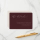 This elegant wedding enclosure card features a sophisticated maroon background with an understated, cursive typography that exudes timeless charm. The design is simple yet refined, focusing on providing essential details in a graceful manner. Perfect for couples aiming to maintain a classic and polished aesthetic at their special event, this card ensures all guests have the necessary information while complementing the overall wedding theme. Its clean layout allows it to seamlessly integrate into any formal or traditional wedding setting.