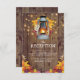 Cartes de réception de mariage rustique à la campagne avec un arrière-plan de grange en bois, feuilles d'automne, une lanterne allumée, guirlande lumineuse et un modèle de mariage moderne.