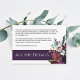 Une carte somptueuse et luxueuse pour permettre à vos clients mariages de connaître tous les détails entourant votre hébergement mariage, le transport, la réception d'accueil et plus encore. Vous pouvez inclure votre site Web mariage si vous en avez un. Ce joli design est à la hauteur de l'invitation et possède un somptueux bouquet aux teintes aquarelles peintes de vin foncé, violet aubergine, orange brûlé, rouge marsala, rose rose profond, beige, turquoise et vert. Une bande de couleur assortie en violet d'aubergine riche forme l'arrière - plan pour mettre en évidence le titre de cette carte. L'aspect est contemporain et artistiquement élégant. Personnalisez le modèle de texte avec vos détails importants.