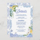 Complétez votre suite de mariage avec cette élégante carte de détails de mariage, intitulée "Summer Mediterranean Lemon Wedding Details Enclosure Card", qui présente des citrons aquarelles peints à la main, des accents de bleu doux et des motifs de carreaux italiens classiques. Parfaite pour les mariages à destination, les célébrations sur la côte amalfitaine ou pour tout couple qui planifie un mariage d'été romantique sur le thème des citrons.