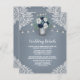 Présentent un fond bleu poussiéreux ou bleu ardoise/acier avec de la dentelle imprimée blanche, des guirlandes lumineuses et un pot Mason rempli d'éléments floraux, de verdure et plus encore.