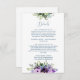 Carte de boîtier couleur violet et verte avec texte bleu marine sur un arrière - plan blanc immaculé. Cette carte chic allie élégance intemporelle et commodité moderne, puisqu'elle comprend un code QR discret pour un accès facile aux détails mariages supplémentaires. Le motif floral plein de vitalité ajoute une touche de sophistication à vos invitations, faisant de cette carte d'enceinte un mélange parfait de tradition et d'innovation pour votre journée spéciale.