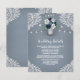 Présentent un fond bleu poussiéreux ou bleu ardoise/acier avec dentelle imprimée blanche, guirlandes lumineuses et un pot Mason rempli d'éléments floraux, de verdure et plus encore.