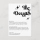 Cette "Retro Black and White Super Bold Script Mariage Encape Card" dispose d'un arrière - plan blanc propre avec du texte noir gras, offrant un design chic et intemporel. Le script super apporte une touche de charme rétro tout en conservant une atmosphère moderne et élégante. Parfait pour partager avec vos invités les détails mariages essentiels tels que l'hébergement, les itinéraires ou les notes spéciales.