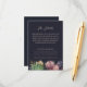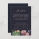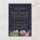 L'Elegant Dark Botanical Succulent Plante Hotel Information Card est un moyen magnifique et pratique de fournir à vos invités tous les détails essentiels pour leur séjour. Les succulents sont peints à la main dans un riche style d'aquarelle gouache, créant une esthétique sophistiquée et élégante. L'arrière - plan noir ajoute à l'atmosphère dramatique et luxueuse de l'invitation. La carte comprend toutes les informations nécessaires, y compris le nom de l'hôtel, l'adresse, le numéro de téléphone, le site Web et les informations sur le bloc de chambre. La carte est conçue pour être à la fois informative et visuellement attrayante, ce qui en fait un ajout bienvenu à votre suite de papeterie mariage.
