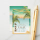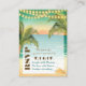 Des palmiers et des lampes à cordes encadrent le coucher de soleil sur l'océan et le rivage de sable sur cette belle carte RSVP mariage plage. Customisez le texte moderne et élégant sur le devant avec vos informations de mariage.