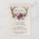 Carte de mariage en bois floral Boho rustique et bois de cerf - La carte comporte des bois de cerf Boho ornés de fleurs magnifiques rose saumon, blanches et bordeaux. Ces invitations bohèmes présentent des bois de cerf en bois avec des fleurs sur un fond en bois.