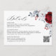 Carte de détails de mariage à thème rouge royal blanc argenté élégant avec code QR présentant un bouquet élégant de roses de couleur rouge rubis royal, cramoisi, argenté, blanc pur et de feuilles d'eucalyptus. N'hésitez pas à me contacter pour toute aide de personnalisation ou si vous avez besoin d'un autre produit avec ce design.