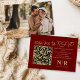 Améliorez votre papeterie mariage grâce à notre Monogramme Mariage noir et or QR Code RSVP avec la Photo Elegant Enclôture Card, un mélange parfait de sophistication classique et de commodité moderne. Réalisée avec une attention minutieuse aux détails, cette carte RSVP présente un décor rouge foncé frappant avec d'élégants accents dorés, créant une atmosphère intemporelle et luxueuse. L'écriture moderne classique ajoute une touche de raffinement, tandis que le design minimaliste assure qu'il complète n'importe quel thème mariage. Personnalisée avec votre monogramme mariage unique et une photo chère, cette carte RSVP capture non seulement l'essence de votre journée spéciale, mais ajoute également une touche personnelle que vos invités apprécieront. L'inclusion d'un code QR simplifie le processus de réponse, ce qui permet à vos invités d'accéder facilement à RSVP avec une simple analyse. Notre modèle de carte RSVP de mariage modifiable vous permet de customiser chaque détail selon votre style et vos préférences, en vous assurant une parfaite adéquation avec vos invitations de mariage. Que vous préfériez une esthétique traditionnelle ou contemporaine, cette carte de réponse mariage QR moderne s'adapte à vos besoins, offrant à la fois élégance et fonctionnalité. Invitation vos invités à partager votre célébration avec notre Mariage noir rouge et or Monogram QR Code RSVP avec Photo Elegant Enclôture Card - une parfaite harmonie de beauté classique et d'innovation moderne qui donne le ton pour une expérience mariage inoubliable.