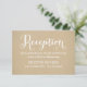 Une carte d'encart de réception coordonnée présentant une écriture calligraphique blanche « Réception » avec les détails du lieu et de l'heure sur un fond de papier kraft chaud. Le design maintient l'esthétique champêtre romantique de la suite dans un format compact pour les informations sur le dîner, les boissons et la danse. Tout le texte est entièrement modifiable.