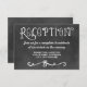 Cartes de réception de mariage charmantes sur tableau noir pour une occasion chic décontractée avec des polices de caractères manuscrites et des motifs de volutes qui ont l'apparence de craie blanche sur un fond qui a l'apparence d'un tableau noir rustique texturé.