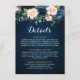Belle carte de détails mariage boho fleurie dispose d'aquarelle peinte à la main graphismes floraux / roses dans les tons riches de bleu marine et rose rousse / pêche et charmante lettrage à la main police. Veuillez me contacter pour toute aide sur la personnalisation ou si vous avez besoin d'un autre produit avec ce design.