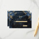 Cette élégante carte d'enceinte RSVP de mariage présente des bouquets de fleurs bleues, agrémentés d'une fausse feuille d'or, dans deux coins, sur une image arrière - plan d'agate d'aquarelle bleu marine. Le texte personnalisable combine des polices serif de couleur or et des polices manuscrites. L'envers est assorti d'un bleu marine et d'un design floral or et agate.