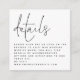 MinI QR code Script Black White Détails du Mariage. Un charmant carré miniature de taille 2,5" à joindre avec vos invitations avec votre code Qr à votre site mariage à l'arrière. L'entête est grande et dans un script informel, avec les détails sous et beaucoup d'espace blanc sur une forme carré pour un style contemporain. Personnalisez facilement le reste du texte. Votre code QR sera généré automatiquement pour mettre à jour l'exemple de code dans la conception, lorsque vous changez simplement l'exemple d'URL dans le modèle avec votre propre URL de site mariage. Vous pouvez modifier le texte et les couleurs arrière - plans à n'importe quel de votre choix via modifier plus loin.